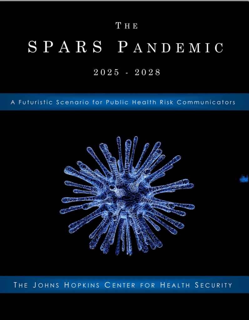 < En 2017, le Johns Hopkins Center of Health Security a organisé une simulation de pandémie à coronavirus appelée scénario SPARS Pandemic 2025-2028. En octobre 2019, la Fondation Bill et Melinda Gates, en collaboration avec Johns Hopkins et le Forum économique mondial, a organisé l’événement 201.